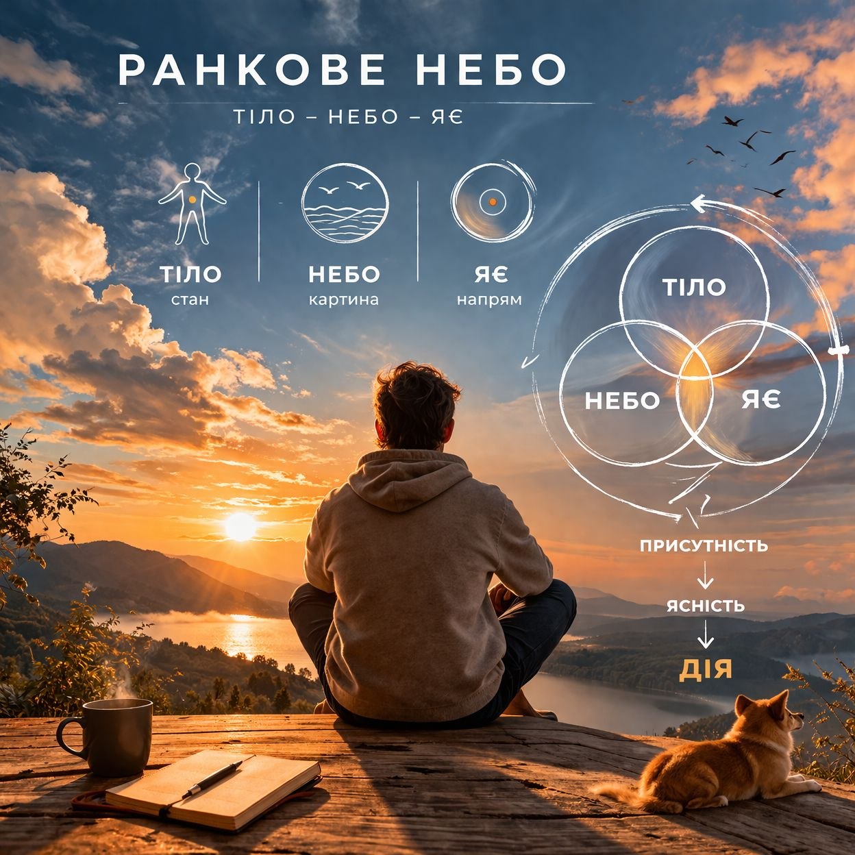 Це не ще одна теорія і не мотивація «зібратись». Це коротка жива практика, яка прибирає внутрішній шум, повертає ясність і допомагає почати день із себе, а не з хаосу.